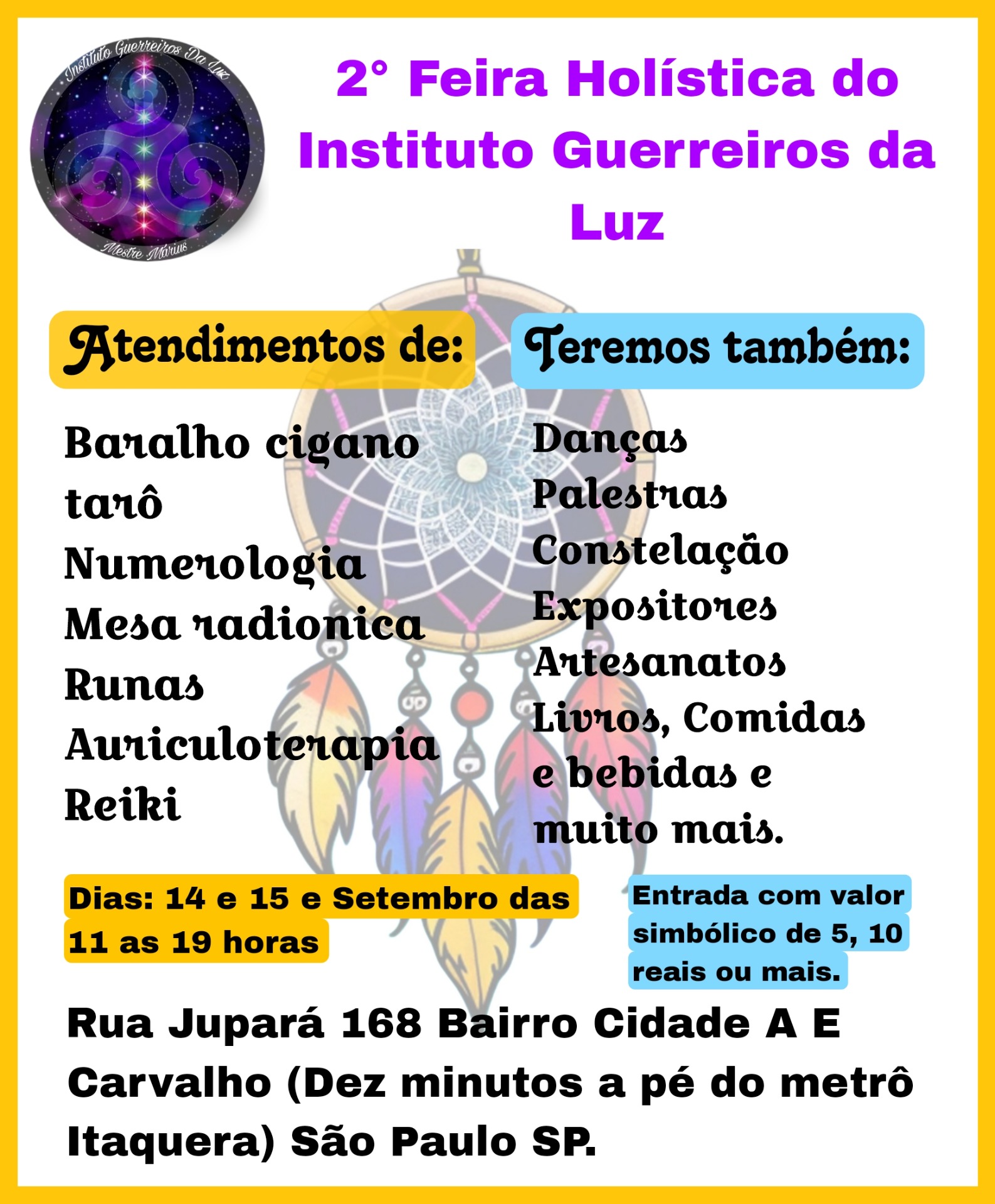 Olá galera venho comunicar que em breve teremos a nossa 2° Feira Holística e vamos ter muitos atendimentos, danças, palestras e ate benzimento gratuito.